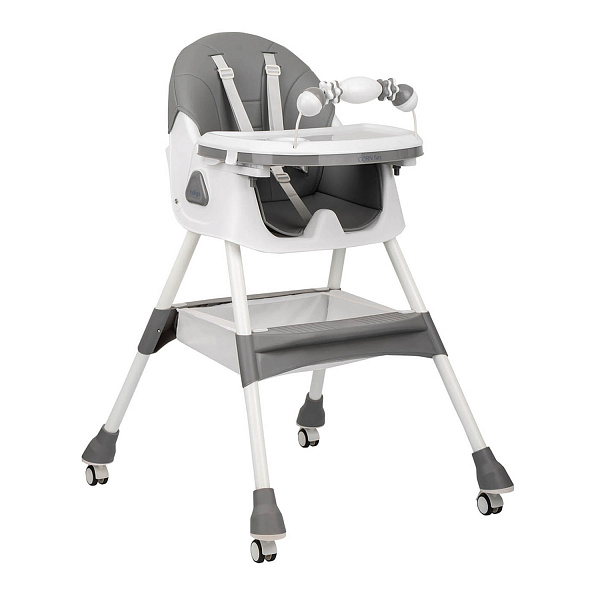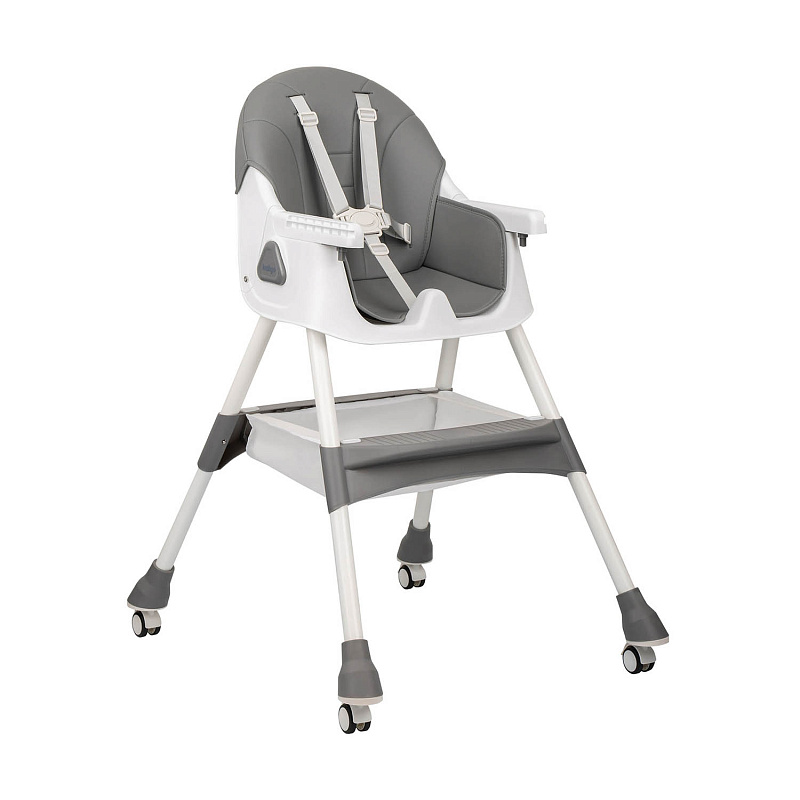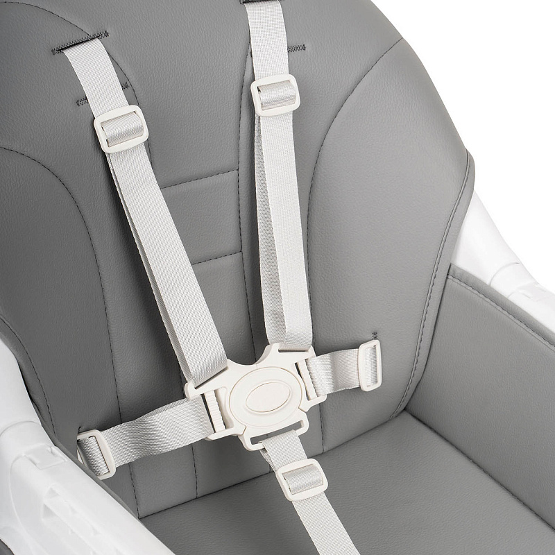 У стульчика есть поворотные колеса с индивидуальными стопорами на каждом колесе для легкости перемещения и одновременно устойчивости. Надежную фиксацию ребенка обеспечивают пятиточечные ремни безопасности.