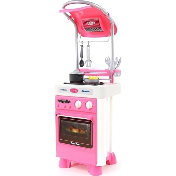 Над варочной панелью расположена вытяжка. Есть световые и звуковые эффекты. Нажав на кнопку, девочка услышит звук работающей вытяжки и проигрывание мелодий.