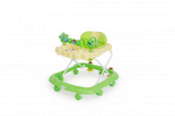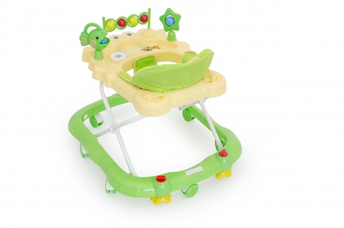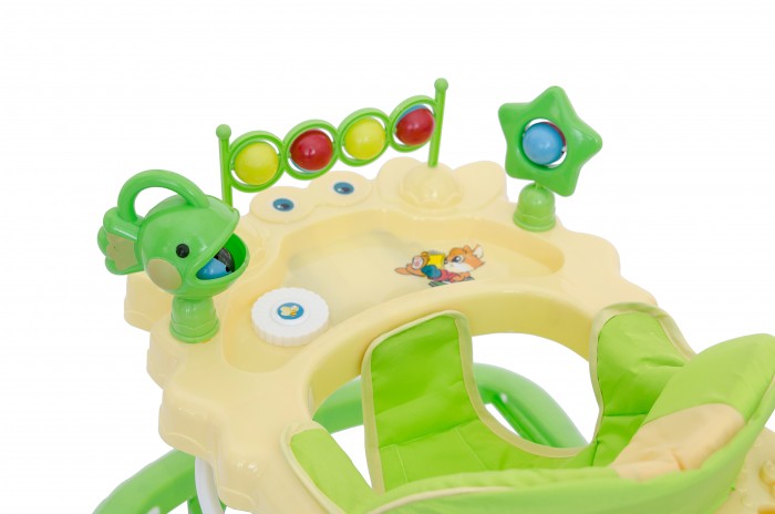 В ходунках глубокое мягкое сиденье с высокой спинкой. Сиденье регулируется по высоте, подстраиваясь под рост малыша. Столик с развивающими игрушками увлекает кроху в интересную игру. Конструкция ходунков прочная, устойчивая и безопасная.
