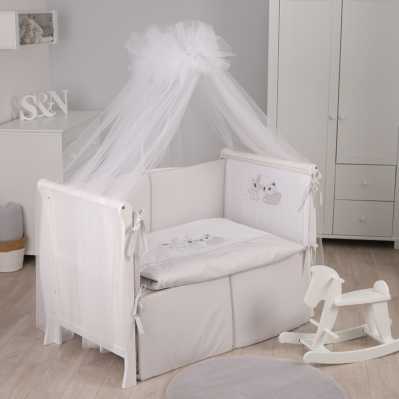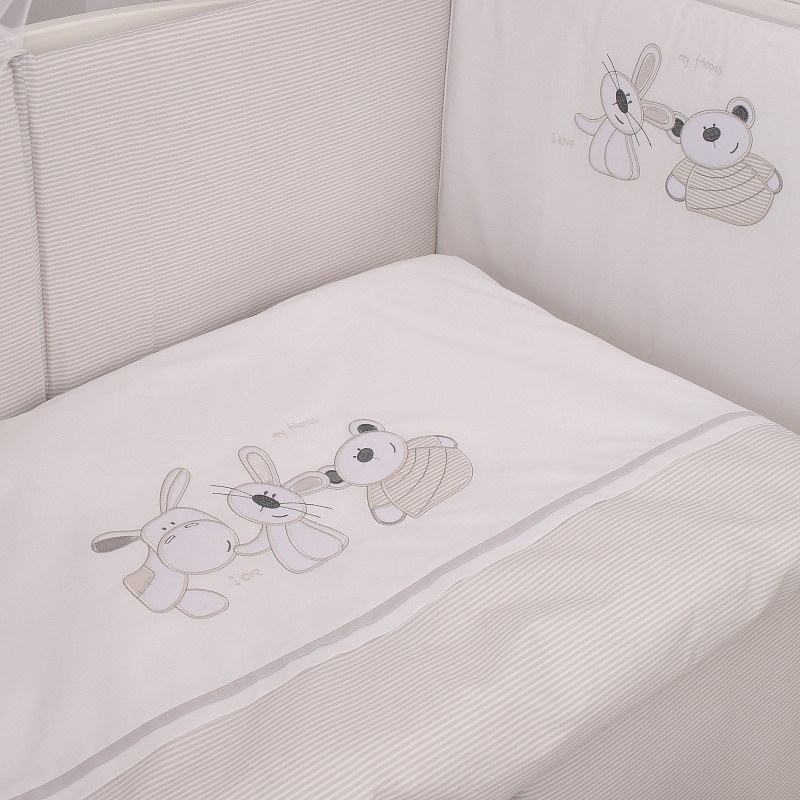 Комплект подходит для кроватей с размером спальных мест - 120x60 см и 125x65 см. Чехлы бортиков застегиваются на молнию, съемные. Одеяло очень легкое, воздушное, гипоаллергенное.