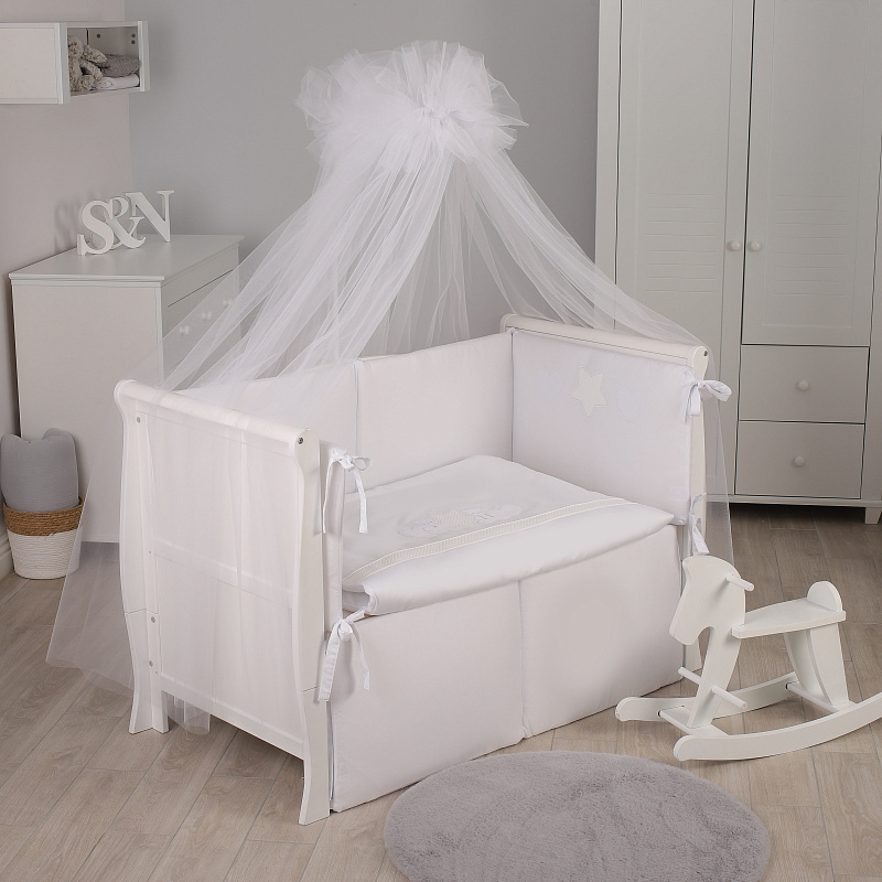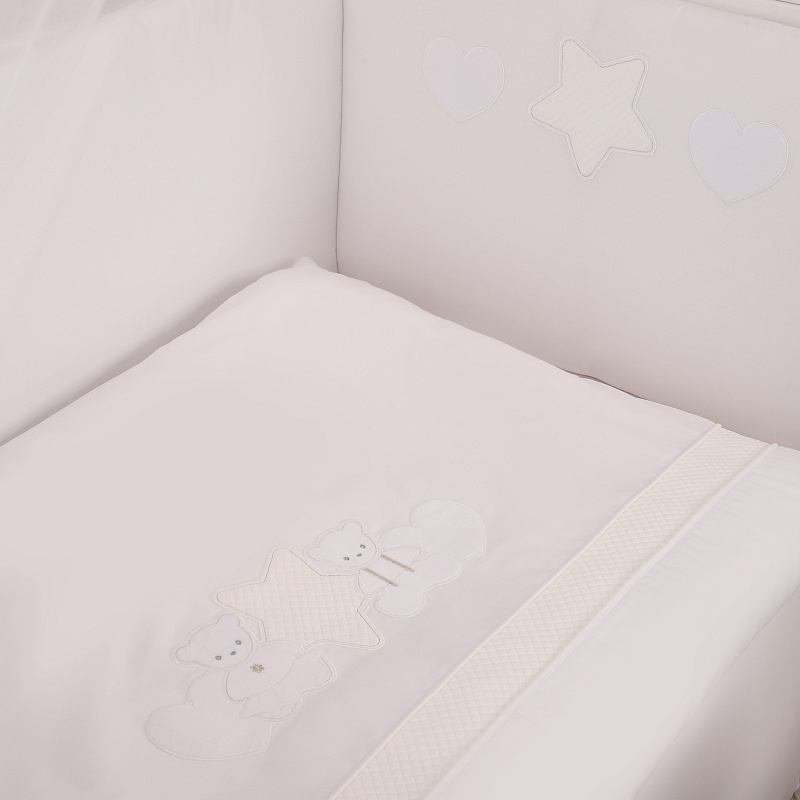 Комплект итальянского бренда применяется в кроватках со спальными местами размером — 120x60 см и 125x65 см. Чехлы на бортиках можно снять для стирки и застегнуть на молнию. Одеяло очень легкое и гипоаллергенное.