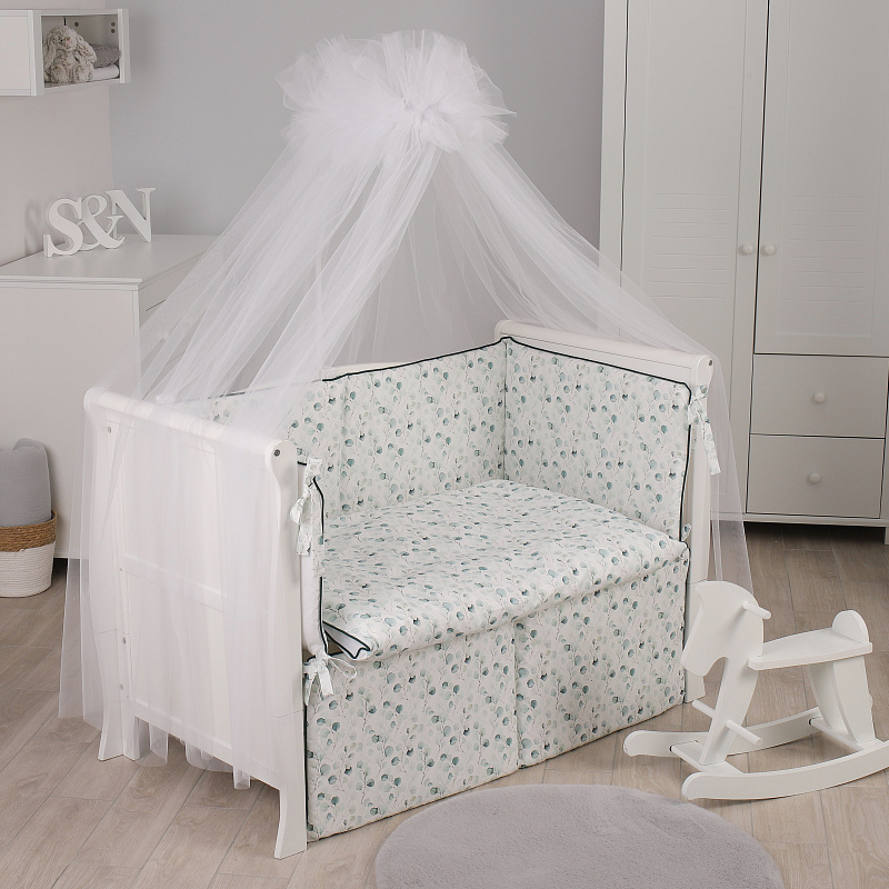 КПБ Eucaliptus подходит для кроваток с размерами спальных мест — 120x60 см и 125x65 см. Чехлы на бортиках съемные, с возможностью стирки. Надеваются и застегиваются на молнию. В набор входит легкое гипоаллергенное одеяло.