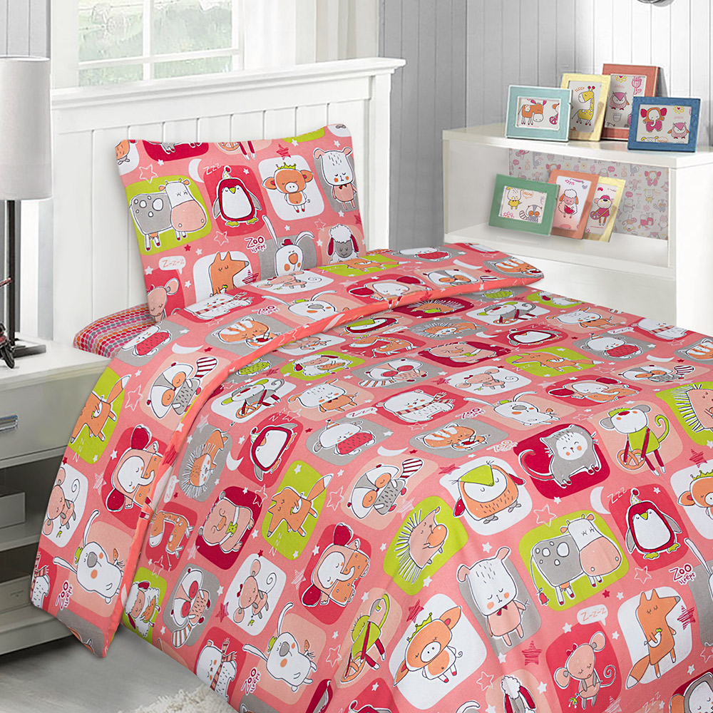 Комплект постельного белья полуторного размера понравится всем детям. На КПБ изображены веселые зверята. Состоит из трех предметов — простыни (215x150 см), пододеяльника (210x145 см) и наволочки (70x50 см). Постельное белье сделано в России из импортной бязи плотностью 120 г.
