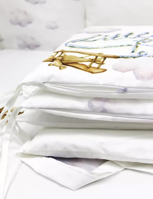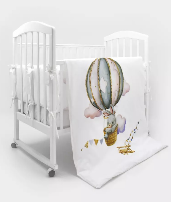 Пододеяльник украшен дизайнерским принтом в виде зайчика на воздушном шаре с флажками и пушистыми облаками. Бортики сделаны из белых подушек, «облаков» и «зайки-пилота». При этом каждый сегмент бортика содержит изображение персонажа с разным сюжетом.