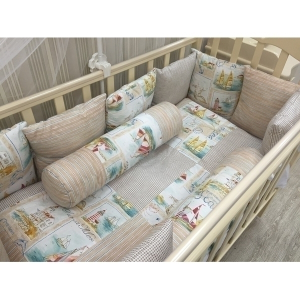 Этот стильный постельный сет очарует вас своим эксклюзивным дизайном в стиле пэчворк. В нем красиво сочетается пастельная цветовая гамма, модные принты в полоску и яркие сюжеты. Малыш с удовольствием будет рассматривать красочные картинки и знакомиться с красотой окружающего мира. Комплект в кроватку GulSara Ялта сшит из антиаллергенной бязи, которая свободно пропускает воздух и не раздражает нежную кожу младенца. В набор входит двенадцать бортиков в виде мягких подушек, которые надежно защищают карапуза от ушибов во время сна и активных забав в кроватке. Также в комплекте есть легкий балдахин из фатина, который оберегает малютку от яркого солнца, назойливых насекомых и посторонних взглядов.