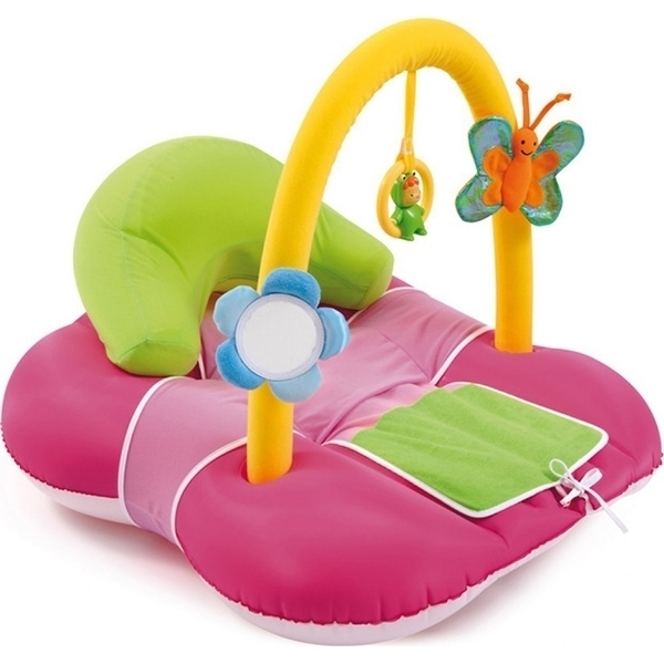 Сначала ребенок может играть с надувным ковриком Smoby Cotoons в двух положениях: лежа на животике или спине. Со временем можно надуть подушку, что позволит карапузу учиться сидеть.