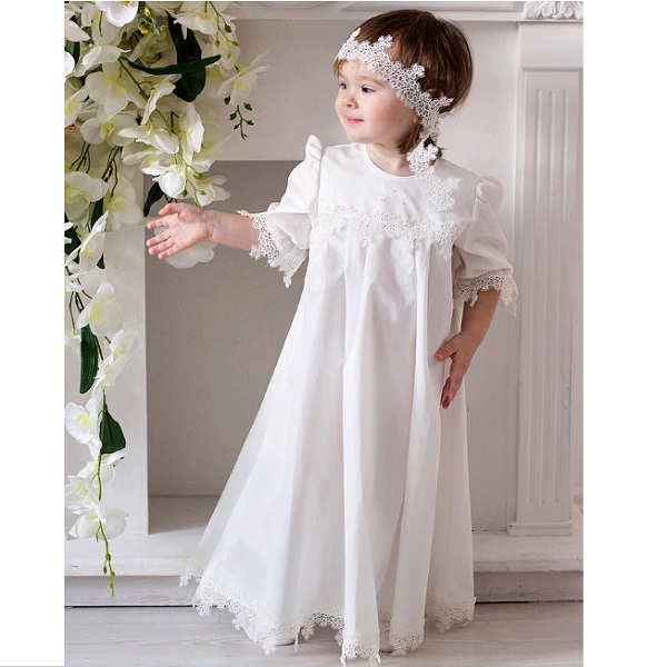 Крестильный комплект для девочки Makkaroni Kids Варвара включает 2 аксессуара. Платье имеет широкий разрез на спинке, оно легко надевается и завязывается с помощью двух лент. Завершает образ маленькой леди изысканная кружевная повязка на голову.