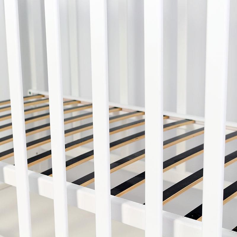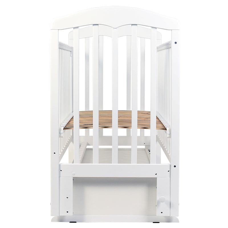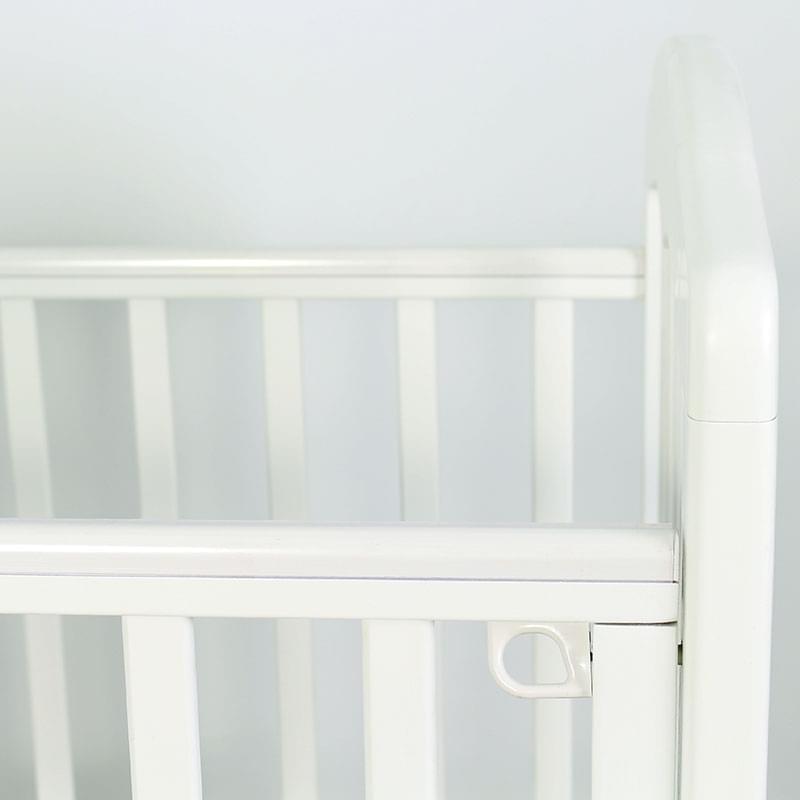 Кроватка «Сильвия» комплектуется опускающейся стенкой переднего ограждения, ортопедическим ложем, универсальным маятником, силиконовой накладкой на стенках ограждения и шириковыми направляющими.