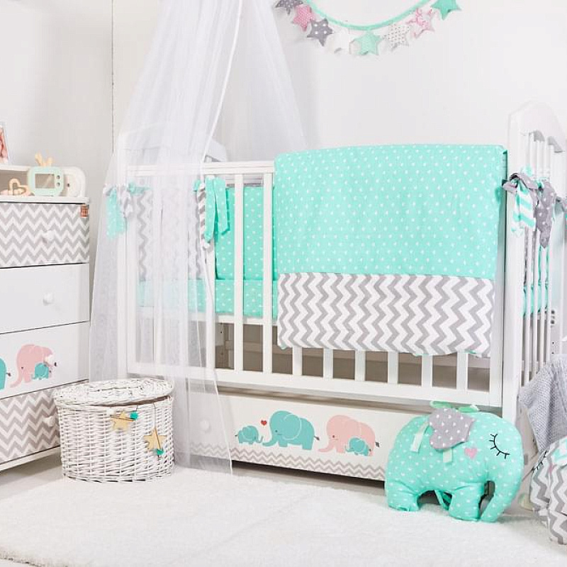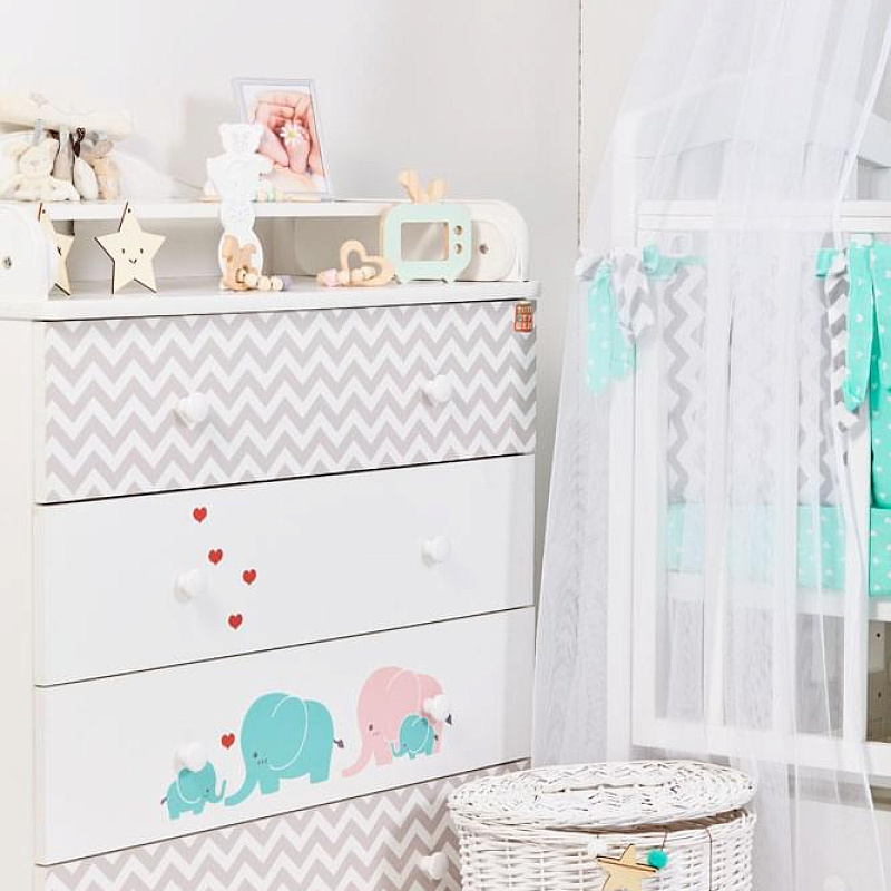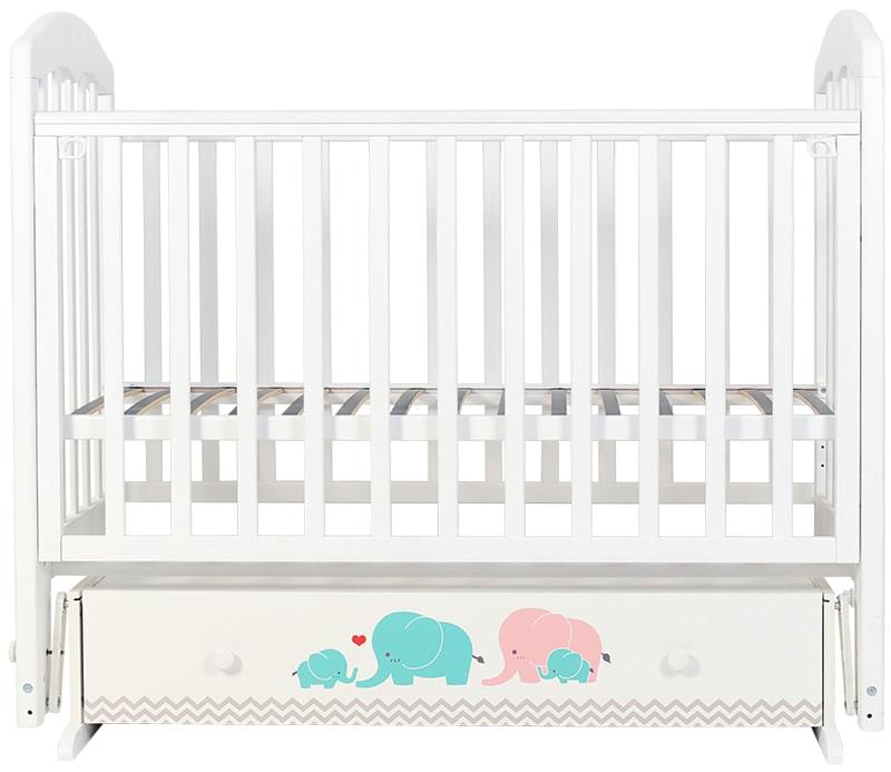 Модель снабжена ящиком для постельного белья, фасад которого украшают принтованные слоники. Чтобы к малышу был удобный доступ, верхнюю стенку переднего ограждения можно опустить простым нажатием кнопки. Ложе имеет ортопедические свойства за счет гнутых реек «латофлекс». Фиксируется в трех положениях.