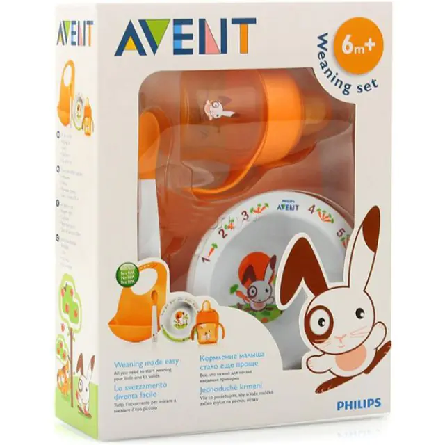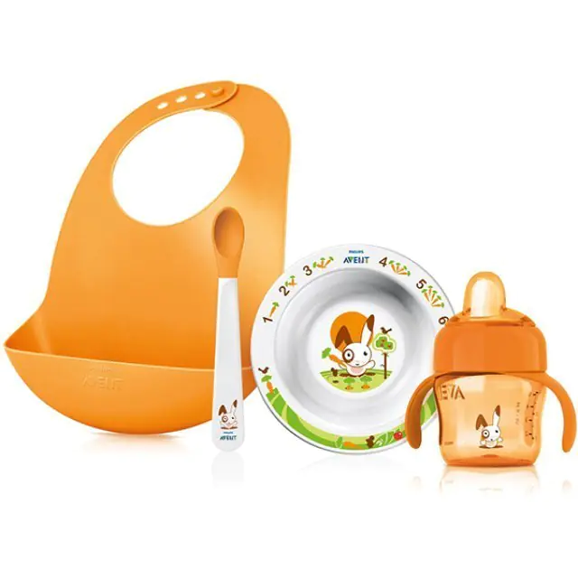 В этот практичный комплект входят все необходимые для малыша первые столовые приборы. Чашка из набора для кормления Avent (Авент) SCF730/00 65730 имеет носик особой эргономичной формы, а тарелка антискользящее основание, предотвращающее проливание еды на стол. Непромокаемый нагрудник оснащен специальным карманом, собирающим упавшие кусочки пищи и пролитую жидкость. Купить набор для кормления Avent (Авент) SCF730/00 65730 можно для малыша с 4-х месяцев за приемлемую цену в интернет-магазине koliaski-krovatki.ru. Дополнительно в комплект входит удобная ложечка с мягким наконечником, не травмирующим десны карапуза.