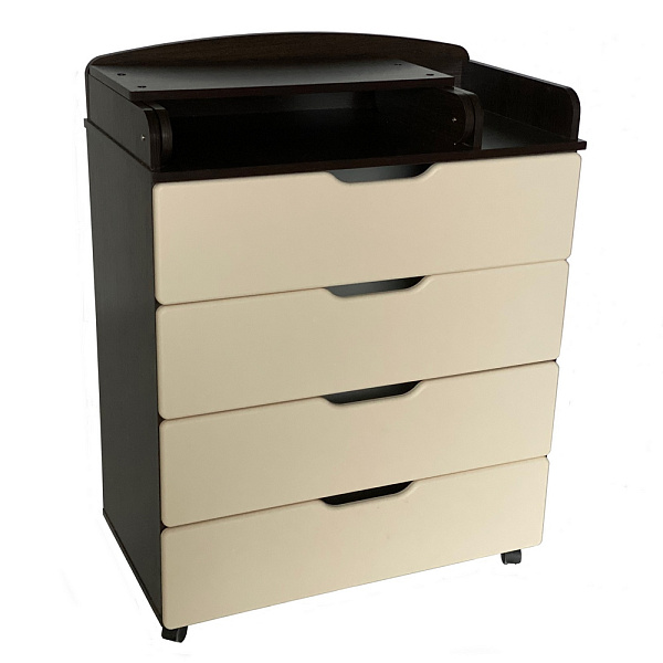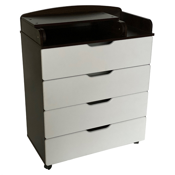 В комоде четыре больших и вместительных ящика на шариковых направляющих. Пеленальный столик раскладной с бортиками для безопасности и комфорта при проведении гигиенических процедур. Колесики делают мебель мобильной, комод можно передвигать по комнате и фиксировать в нужном месте. Гарантийный срок от производителя — 18 месяцев.