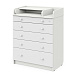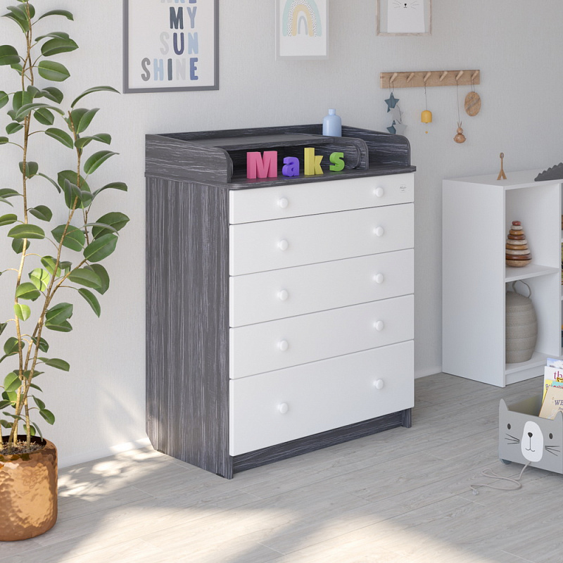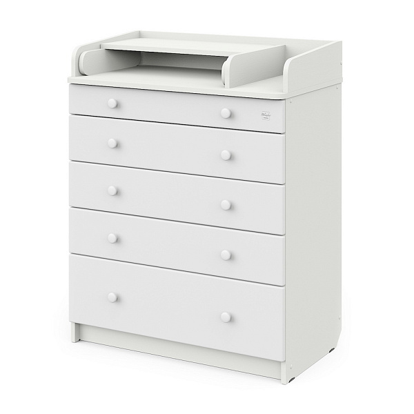 В Maks применяется столик для пеленания с простой и надежной системой раскладывания. Рядом с пеленальным столиком предусмотрено отделение для средств по уходу за ребенком. Комод весьма вместительный, включает пять ящиков, установленных на надежные шариковые направляющие с бесшумным ходом. Один из ящиков — нижний — имеет большую глубину, а верхний оснащен органайзером для более удобной сортировки детских вещей.
