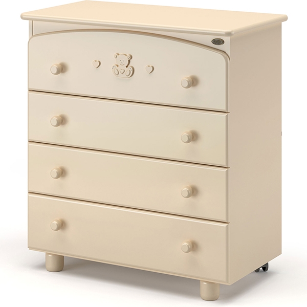 Особого внимания заслуживает элегантный дизайн комода. Лаконичность линий подчеркнута натуральными цветами и очаровательным декором в виде сердечек и медвежонка на фасаде верхнего ящика.