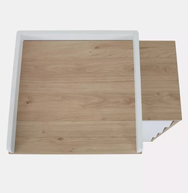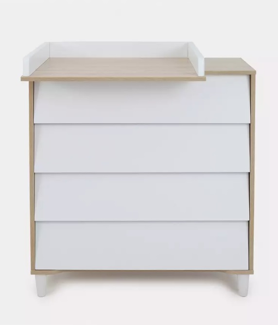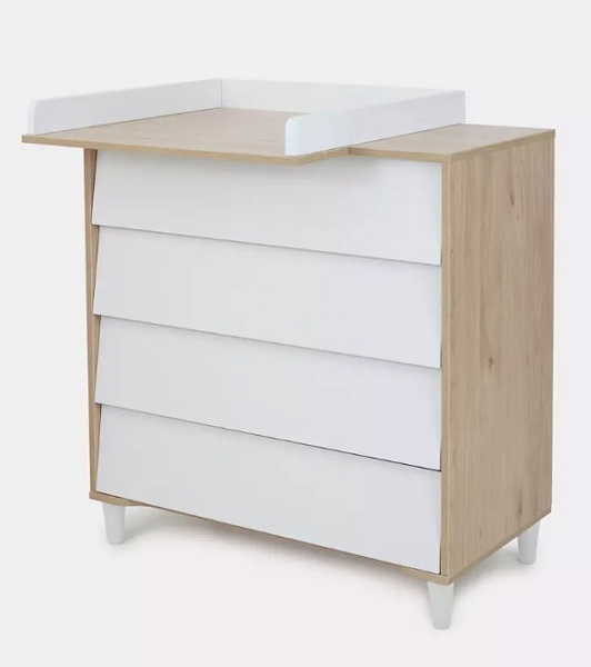 Изделие характеризуется эффектными наклонными фасадами, которые выгодно выделяют этот предмет мебели на фоне аналогичных комодов. В комоде имеется откидной бортик, который превращает изделие в полноценный пеленальный столик. Когда ребенок подрастет, бортик можно убрать, причем без следов от отверстий.