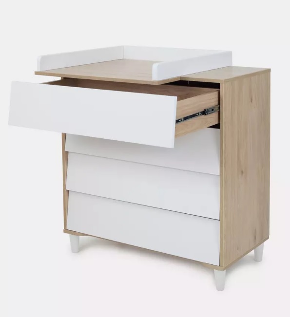 Пеленальный бортик эргономичен, фиксируется в ряде позиций по длине. Это позволяет установить его так, как удобно родителям. Сохранность детских вещей обеспечивают вместительные ящики на телескопических направляюших, которые гарантируют отсутствие шума и безопасность.