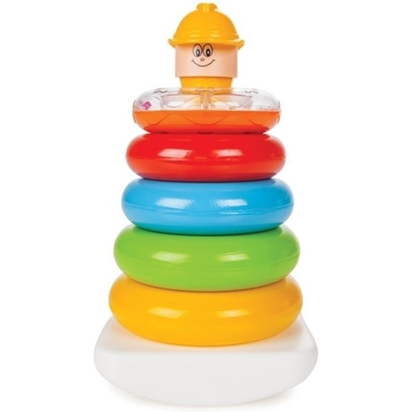 Эта забавная игрушка сразу увлечет маленького озорника и не оставит его равнодушным. Яркие цвета, оригинальные фигуры и необычные звуки заинтересуют малыша и позволят ему с головой окунуться в красочный мир забав и развлечений. Пирамидка-неваляшка Pilsan Веселые кольца имеет округлую форму, благодаря чему она легко раскачивается со стороны в сторону. Верхушка сделана в виде головы человечка в яркой каске. Основа состоит из цветных колечек разного размера, одно из них наполовину прозрачное и наполнено гремящими шариками. После того, как малыш соберет пирамиду и легонько ее толкнет, она начнет двигаться под звон бусинок.