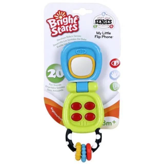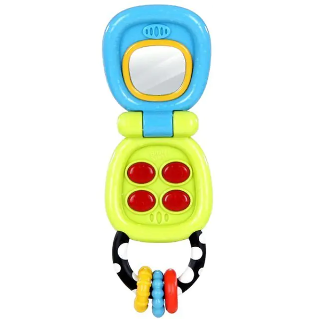 Телефон-раскладушка состоит из двух функциональных элементов. Одна часть развивающей игрушки Bright Starts (Брайт Стартс) Мой Телефон 9019 сделана в виде небьющегося оригинального зеркальца, с помощью которого малютка познакомится со своим отражением. Вторая часть зеленого цвета оснащена красными клавишами, которые при нажатии издают интересные звуки и мигают яркими огоньками. Купить развивающую игрушку Bright Starts (Брайт Стартс) Мой Телефон за приемлемую цену можно в интернет-магазине koliaski-krovatki.ru. К ручке изделия прикреплены три разноцветных колечка-прорезывателя.
