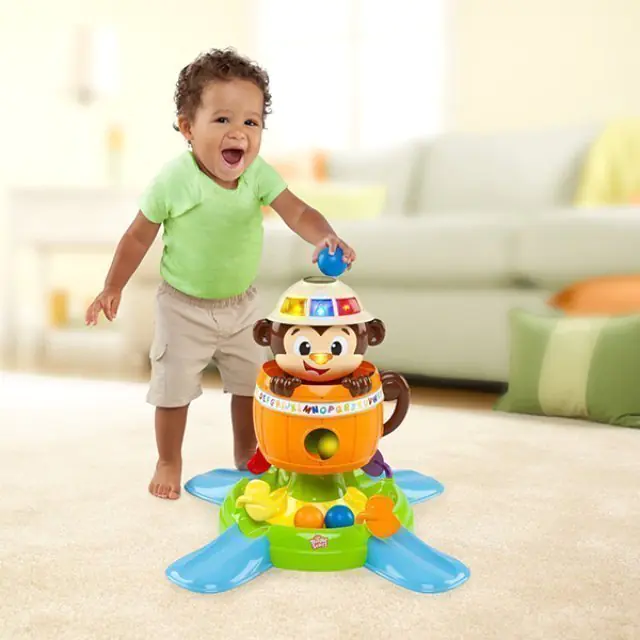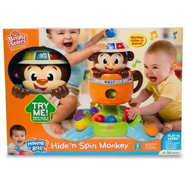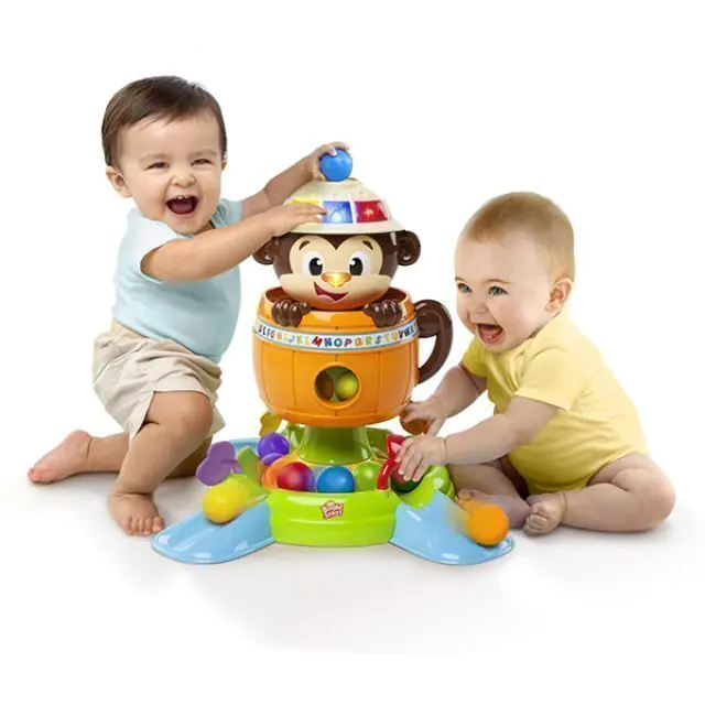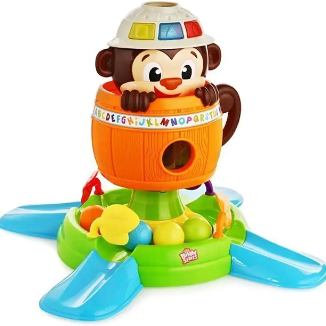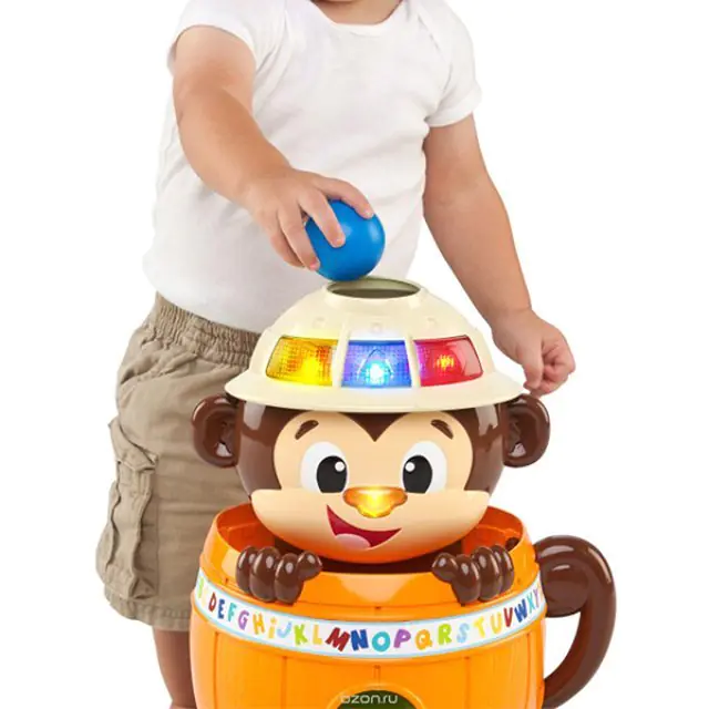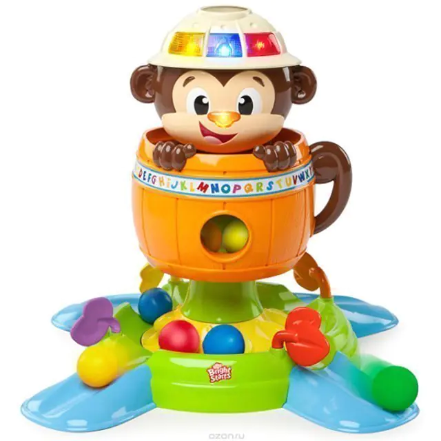 Веселая мартышка научит вашего любопытного карапуза распознавать геометрические формы и цвета. Кроме того, развивающая игрушка Bright Starts (Брайт Стартс) Обезьянка в Бочке 52094 укажет крохе, где на ее мордочке находятся глазки, ротик и носик. В комплекте с мартышкой предусмотрены пять мячиков, которые маленький непоседа должен научиться забрасывать в специальное отверстие. Купить развивающую игрушку Bright Starts (Брайт Стартс) Обезьянка в Бочке по приятной цене стоит для тех детишек, которые только начинают ползать, стоять и ходить. Если нажать на ее нос, обезьяна прячется в бочке, а мячики падают в лоток и вращаются по кругу.