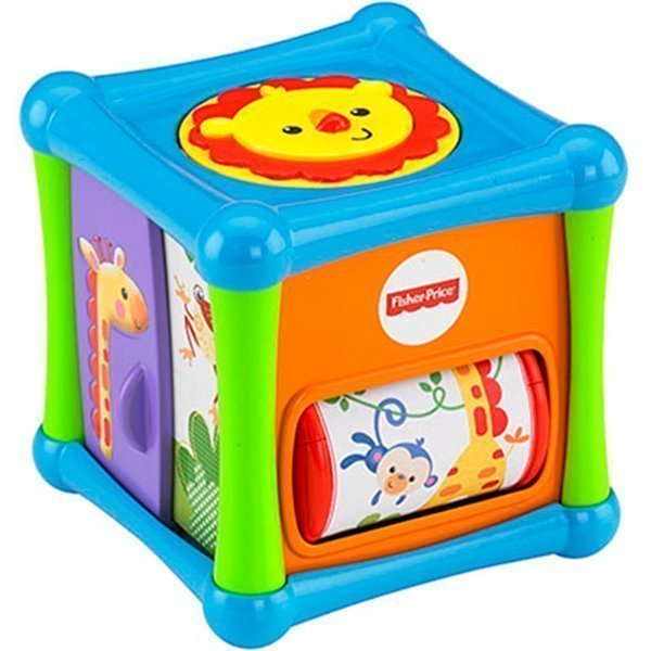 Развивающий кубик Fisher-Price Веселые Животные (Mattel) — это пять разных панелей для познавательных и увлекательных игр. Любопытный карапуз сможет играть с львенком. При нажатии на его симпатичную мордочку, тот будет пищать. Перевернув куб Fisher-Price Веселые Животные FP BFH80, малыш сможет изучить свое изображение в зеркальце или покрутить валик с яркой наклейкой. На одной из сторон игрушки живет жабка-трещетка. Передвигая ее по вертикали, ребенок будет слышать занимательный звук. На последней стороне развивающего кубика Фишер Прайс Веселые Животные (Маттел) расположена дверца для игры в «Ку-Ку».