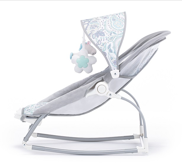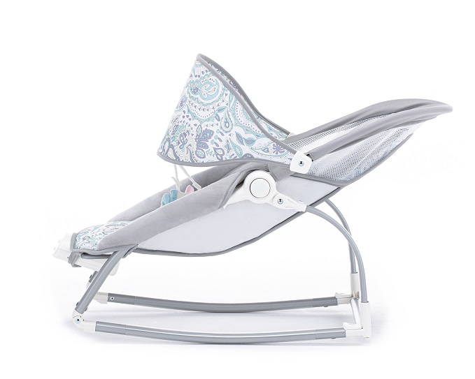 У шезлонга-качелей удобный козырек с закрепленными подвесными игрушками. Козырек защищает малыша от активных солнечных лучей. Приспособление очень легкое, работает от батареек. Благодаря надежному металлическому основанию качелями можно пользоваться на любой ровной поверхности. Сборка быстрая, ножки очень просто вынимаются из креплений сиденья.