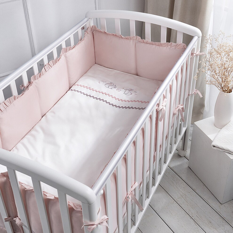 Все детали бортиков прикрепляются к кроватке с помощью надежно пришитых завязок. На концах завязок стоят закрепляющие швы, благодаря чему они не расходятся и прослужат долго. Также завязки добавляют бортикам нежного изящества.