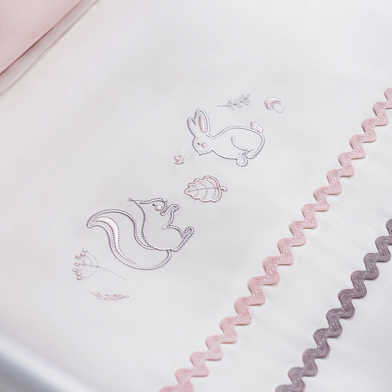 По дизайну комплект продуман до мельчайших деталей. Пастельные тона подходят для любого интерьера. Когда малыш просыпается, он рассматривает рисунки на пододеяльнике, выполненные в виде вышивки.
