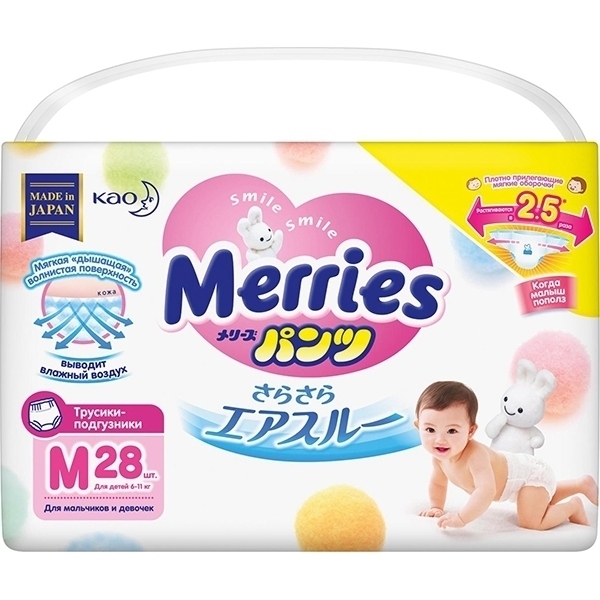 Трусики-подгузники для детей Merries M, 6-10 кг, 28 штук