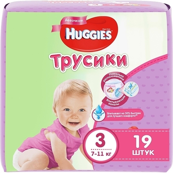 Трусики / подгузники для девочек Huggies 3, 7-11 кг, 19 штук