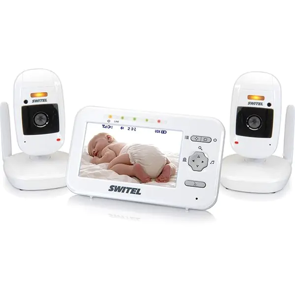 Эта модель получила увеличенный дисплей диагональю 4,3 дюйма и две камеры, которые можно установить в разных комнатах. Благодаря такому исполнению видеоняня Switel BCF986 Duo предоставляет родителям больше возможностей для наблюдения за ребенком. Ведь теперь маме с папой не придется постоянно переносить камеру и каждый раз устанавливать ее в новом месте. Устройство работает на расстоянии 250 метров в дневном и ночном режиме, проигрывает колыбельные и оповещает родителей о том, что малыш проснулся и начал плакать. В этом устройстве вы для себя найдете надежного помощника, который будет постоянно следить за состоянием вашего любимого карапуза. Ведь оно дополнительно оснащено термометром и световой индикацией громкости плача ребенка.