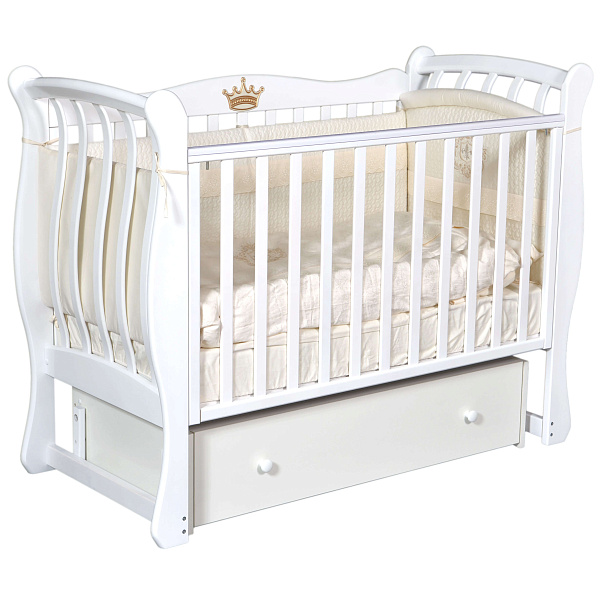 Спальное место сделано из деревянных реек, которые образуют ортопедическое ложе. Оно хорошо вентилирует воздух, что очень хорошо с точки зрения здоровья. Ложе имеет два положения, чтобы мама могла регулировать высоту в зависимости от роста и возраста ребенка. Под спальной основой располагается вместительный закрытый ящик для вещей. Аппликация "Корона" в комплект кроватки не входит и приобретается отдельно.