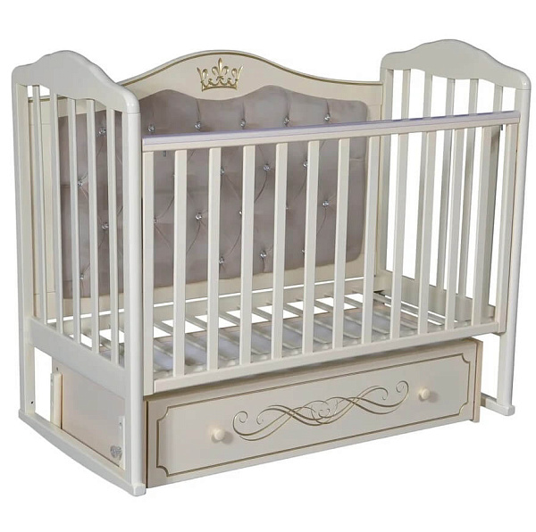 Кровать от российской компании «Кедр» предназначена для детей от 0 до 3 лет. Отличительной особенностью «Элен» 7 является мягкая задняя стенка, обитая велюровой тканью. Статуса кроватке добавляет изображение короны.